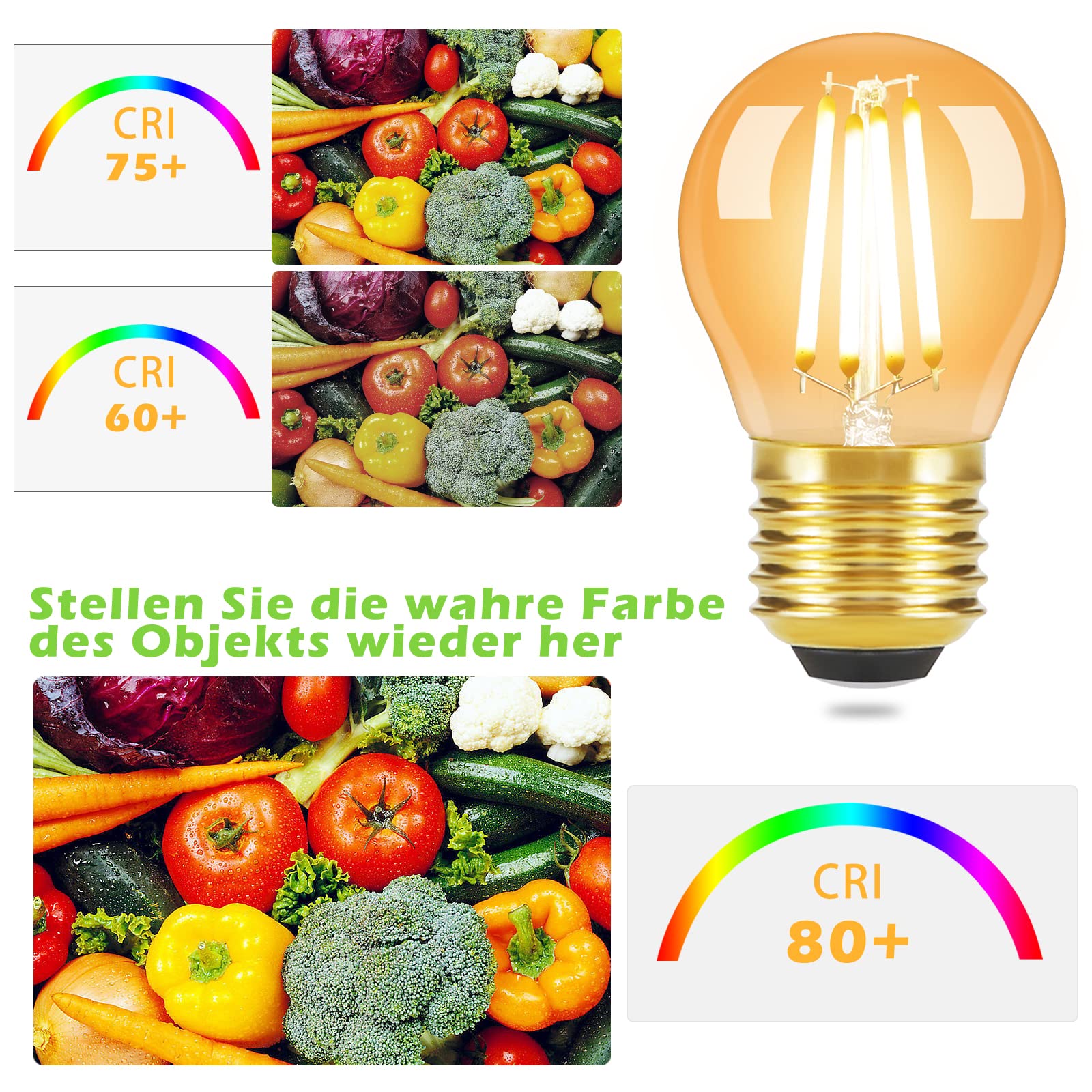 Energiesparend & Umweltfreundlich: Diese G45 4W LED ist Energiesparbirne, ersetzt die herkömmliche 40W-Glühlampe, durchschnittlich 20000 Stunden Lebensdauer, dies spart bis zu 90% gegenüber herkömmlichen Glühlampen; Mit hochwertigen LED-Filamenten ist die Lichtquelle konstant und nicht flackert. Keine UV-und IR-Strahlung und nicht enthalten Blei, Quecksilber und andere Verschmutzung Elemente.