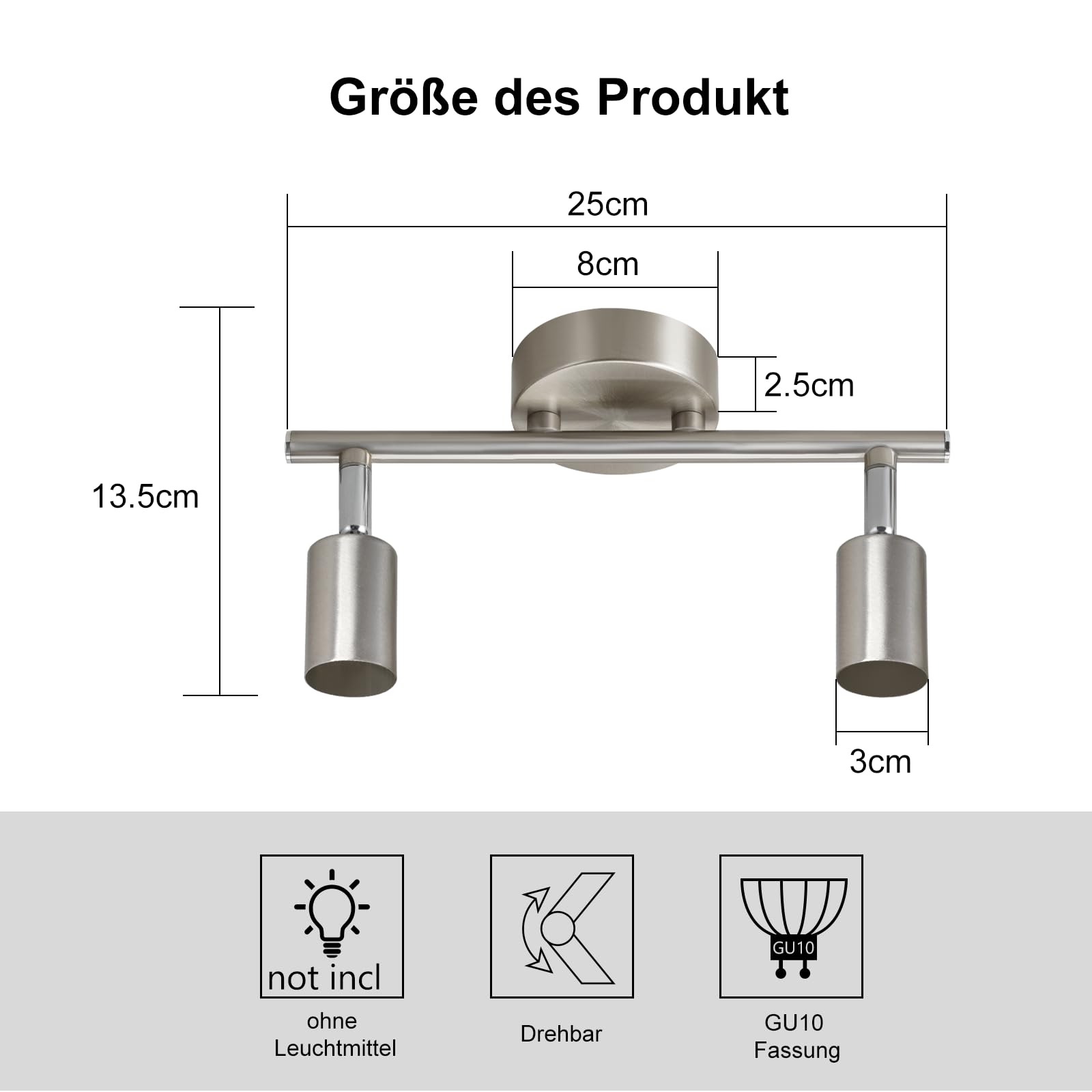 GU10 spotlight, max 25W (excluding light source), sand nickel finish. Input: 220-240VAC, IP20, iron. Lamp dimensions: 25*8*13cm; Packing dimensions: 10*9*26cm/0.35kg; Carton dimensions: 48*43*55cm/15.2kg/40 pieces