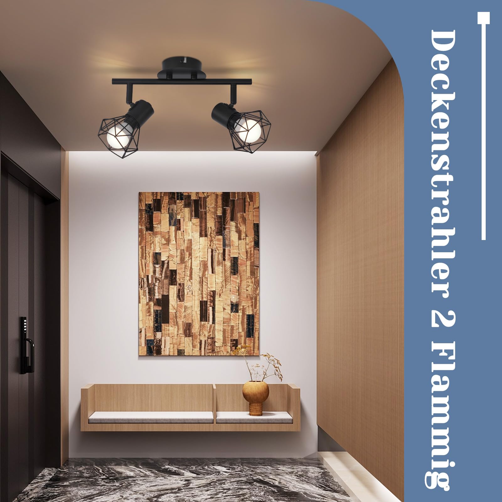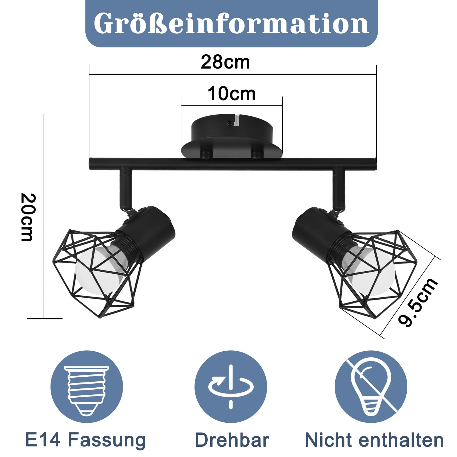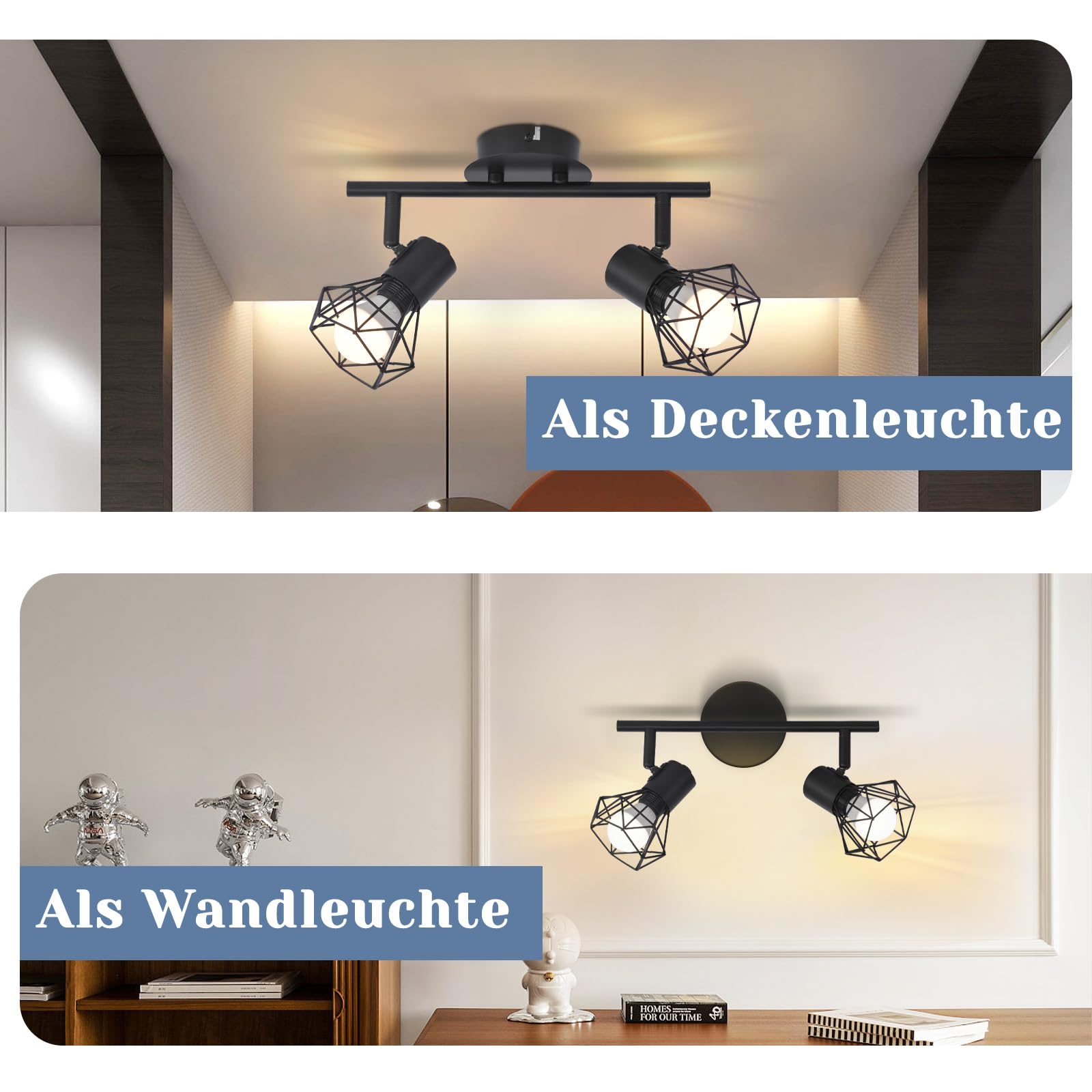 Die Deckenstrahler 2 flammig ist im Retro Industriestil mit kreativen schwarzen Draht Wandstrahler gestaltet, diese Wandleuchte innen ist robust und langlebig, einfach und klassisch, sicher und zuverlässig, diese Deckenspots Schwarz verfärbt sich nicht so leicht, die Oberflächenfarbe bleibt lange erhalten und lässt sich in jeden Wohnraum integrieren, Perfekt für den Innenbereich.