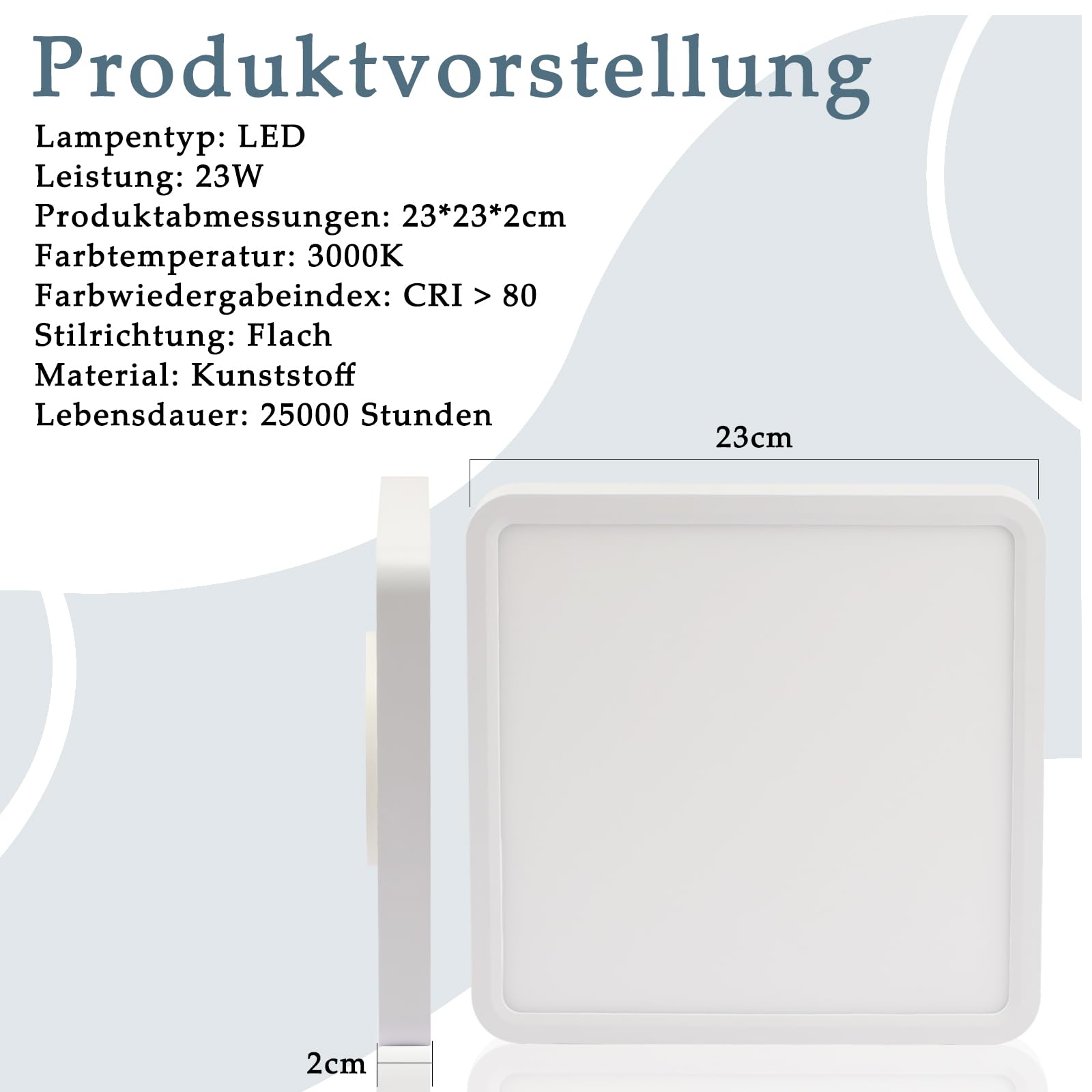 Dimensions: 23232cm; Voltage: 230V; Power: 23W; Dimmable: No; Color Temperature: 3000K – Warm White; Protection Rating: IP44; Material: Plastic; Integrated LED light sources ensure high energy efficiency and a lifespan of 25,000 hours.