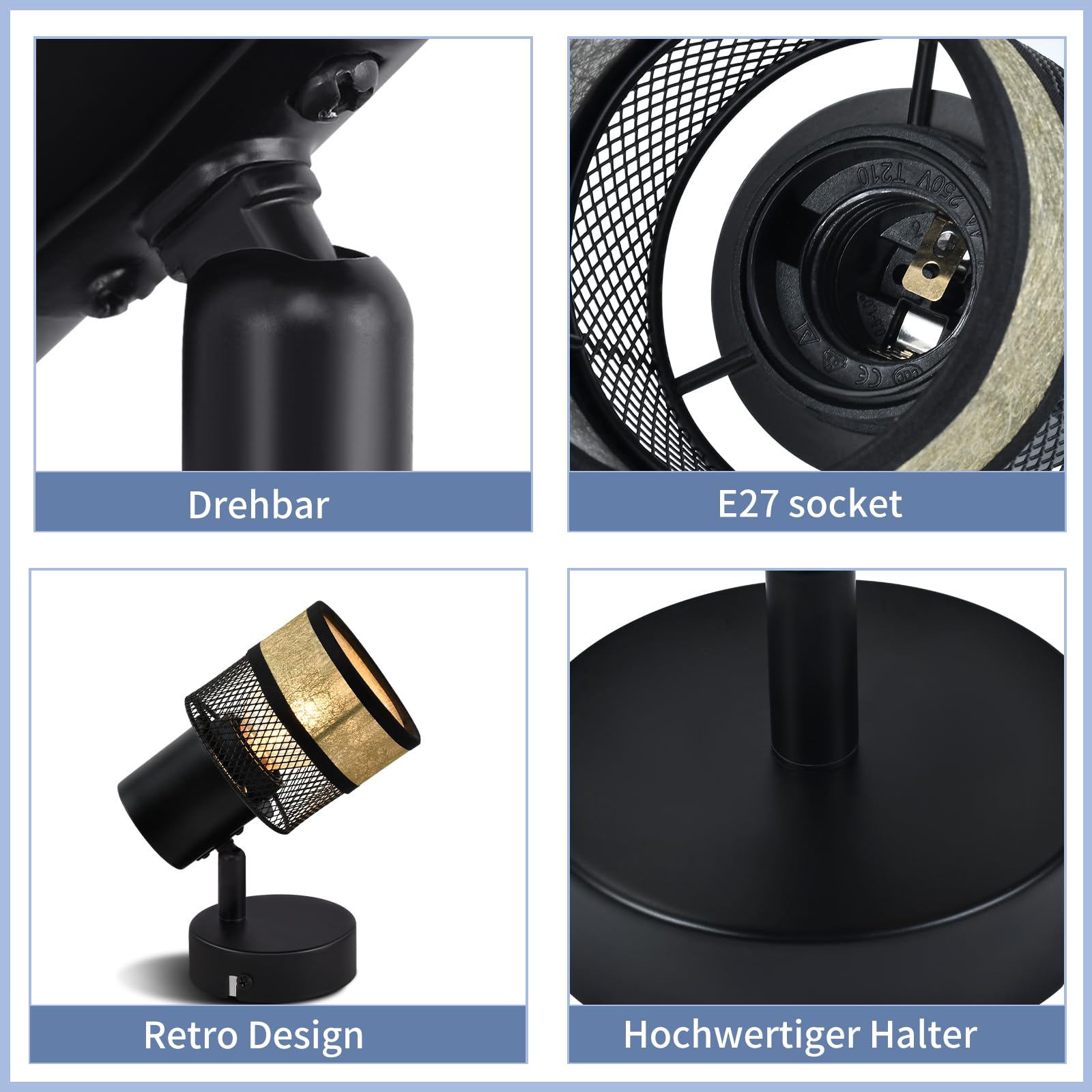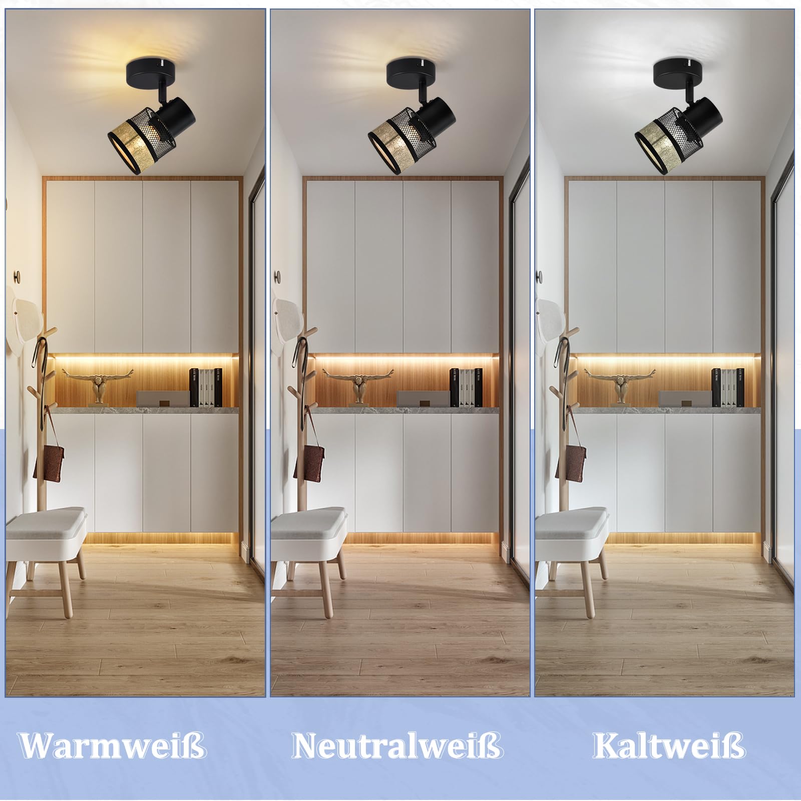 Die Deckenstrahler Schwarz hat ein E27 Sockel Design und kann mit jeder E27 Lampe installiert werden, einschließlich normaler LED und Leuchtmitteln. Sie können auch E27 Lampen mit verschiedenen Farbtemperaturen nach Ihren Wünschen installieren, um verschiedene Lichtumgebungen zu erreichen.