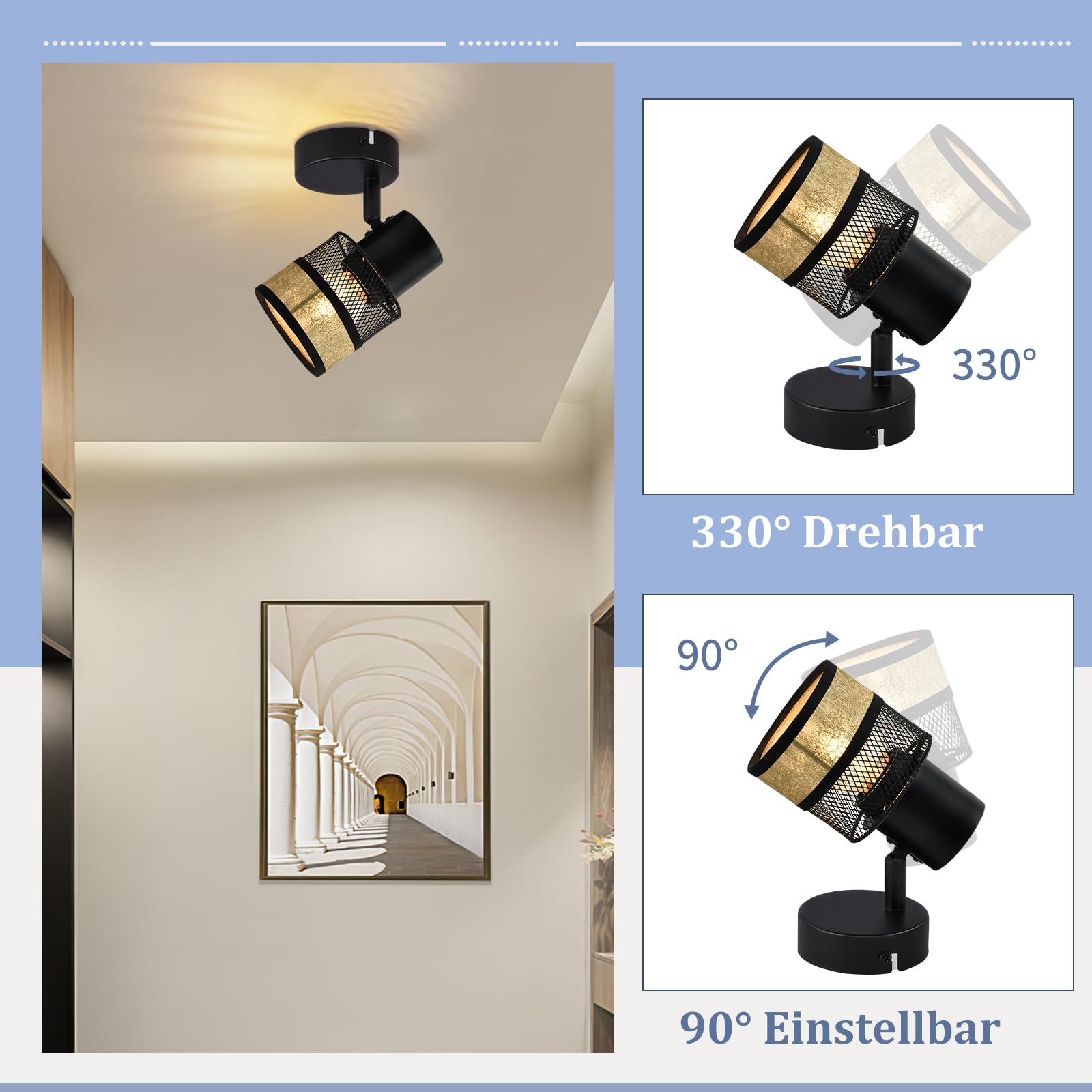 Deckenstrahler 1 Flammig Schwarz Deckenleuchte - Deckenlampe Flur Metall Vintage mit Gold Stoffschirm Deckenspot E27 LED Max.40W 330°schwenkbar für Wohnzimmer Schlafzimmer Küche