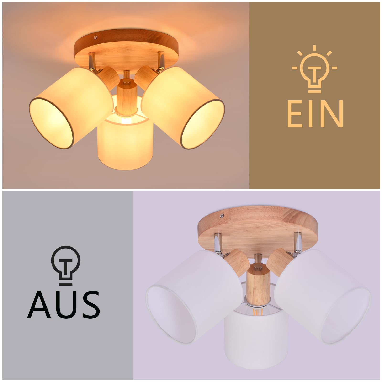 【Justierbarer Drehwinkel】Mit einem drehbaren Kopf von 350°bietet diese Holzlampe uneingeschränkte Flexibilität in der Leuchtrichtung. Wandleuchten, perfekt für das Hervorheben spezifischer Bereiche oder das Schaffen eines fokussierten Glücks, diese Deckenlampe Wohnzimmer wird Ihre Beleuchtungsbedürfnisse mühelos erfüllen.