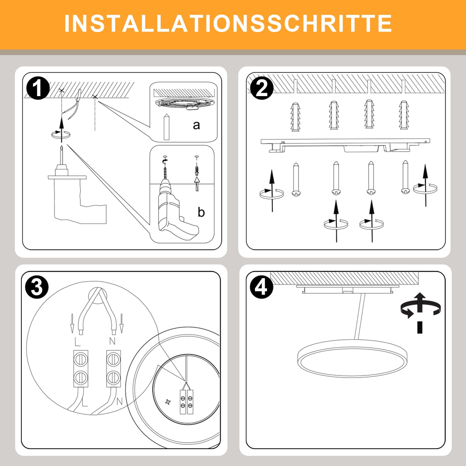 Abmessungen: 30*30*2.6 cm; Spannung: 230 V, Leistung: 24 W; Dimmbar: Ja; Farbtemperatur: 3000 K - 6500 K; Schutzart: IP44; Material: Kunstoff und PC; Die integrierten LEDs Leuchtmittel sorgen für eine gute Energieeffizienz und eine Lebensdauer von 20000 Stunden