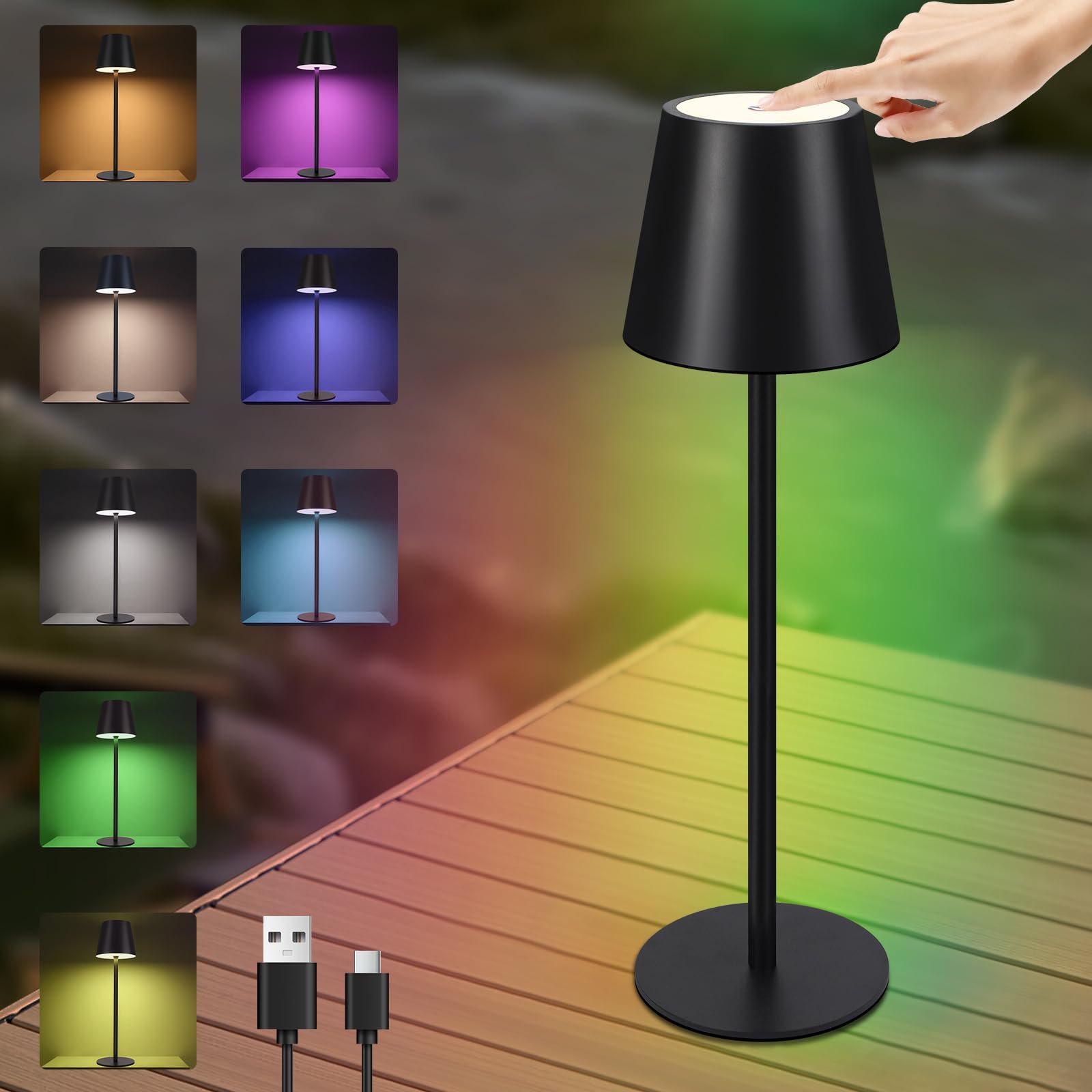 Tischlampe LED Tischleuchte RGB - Nachttischlampe Touch Dimmbar Akku Schreibtischlampe Kabellos Schwarz IP54 Bettleuchte Tisch USB Tischlampe Aufladbar Metall für Schreibtisch Nachttisch