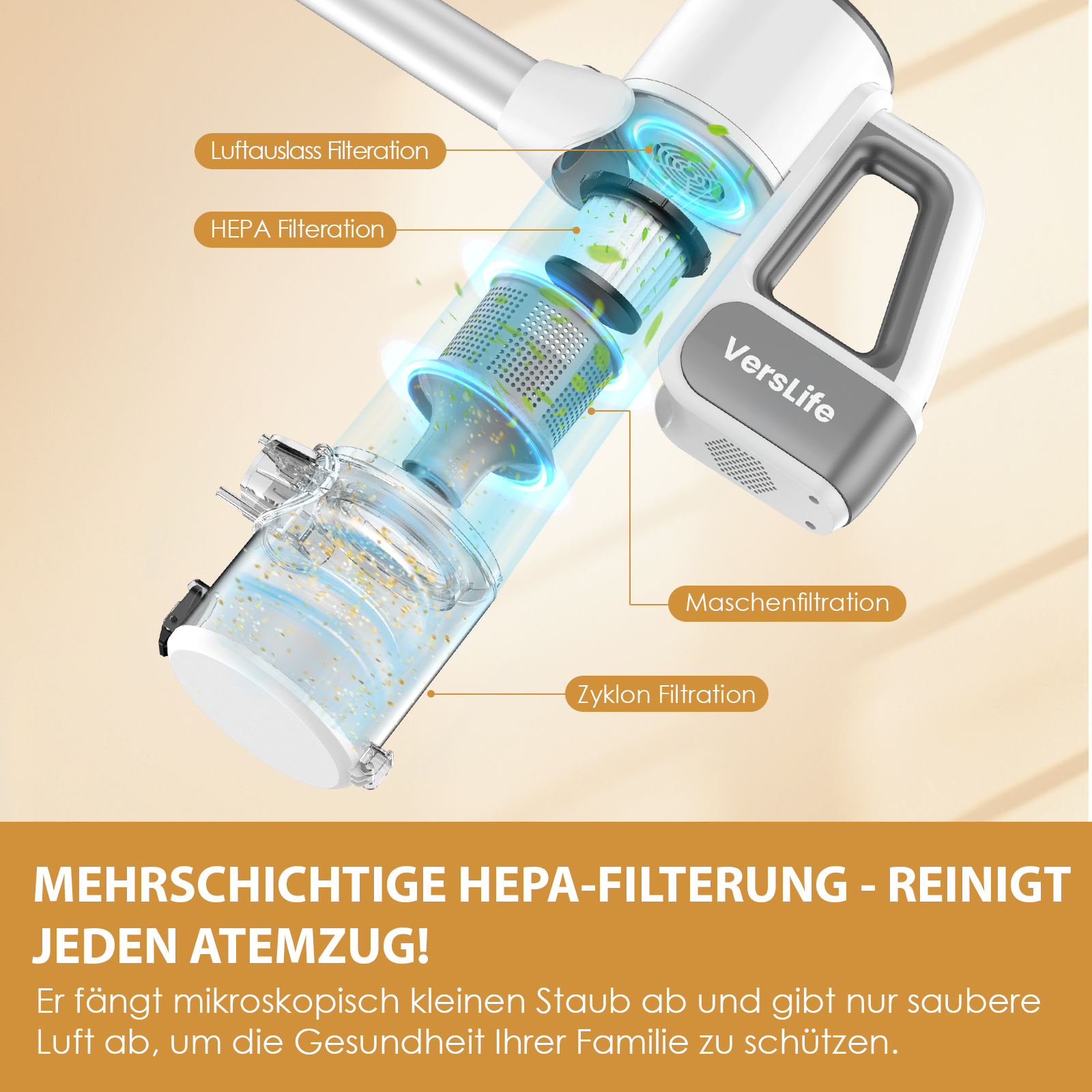 • [4-lagiges Filtersystem & 900 ml großes Fassungsvermögen & One-Touch-Entsorgung & Waschbar] Dieser Staubsauger verfügt über ein leistungsstarkes 4-lagiges Zyklon-Filtersystem, das vier verschiedene Filtertechnologien mit einem leistungsstarken HEPA-Filtersystem kombiniert, um Feinstaub, Bakterien und Allergene effektiv aus der Luft zu entfernen. Mit einer Filtereffizienz von 99,99 % ist die Luft nach jeder Reinigung frischer und gesünder. Ob Böden, Teppiche oder Möbel – er entfernt mühelos alle Arten von Schmutz und Staub und hinterlässt Ihr Wohnumfeld sauberer und hygienischer. Der große 900-ml-Staubbehälter reduziert zudem die Notwendigkeit häufiger Entsorgungen, selbst bei längerem Gebrauch. Der Staubbehälter ermöglicht die One-Touch-Entsorgung und sorgt so für eine freihändige, hygienische Bedienung sowie verbesserte Benutzerfreundlichkeit und Effizienz. Regelmäßige Reinigung sorgt für kontinuierliche Saugleistung.