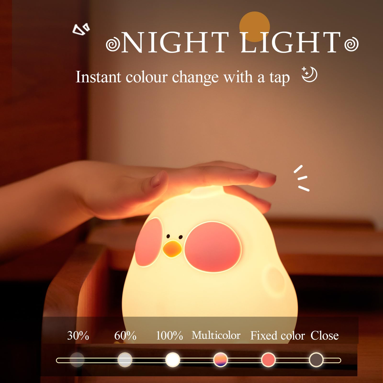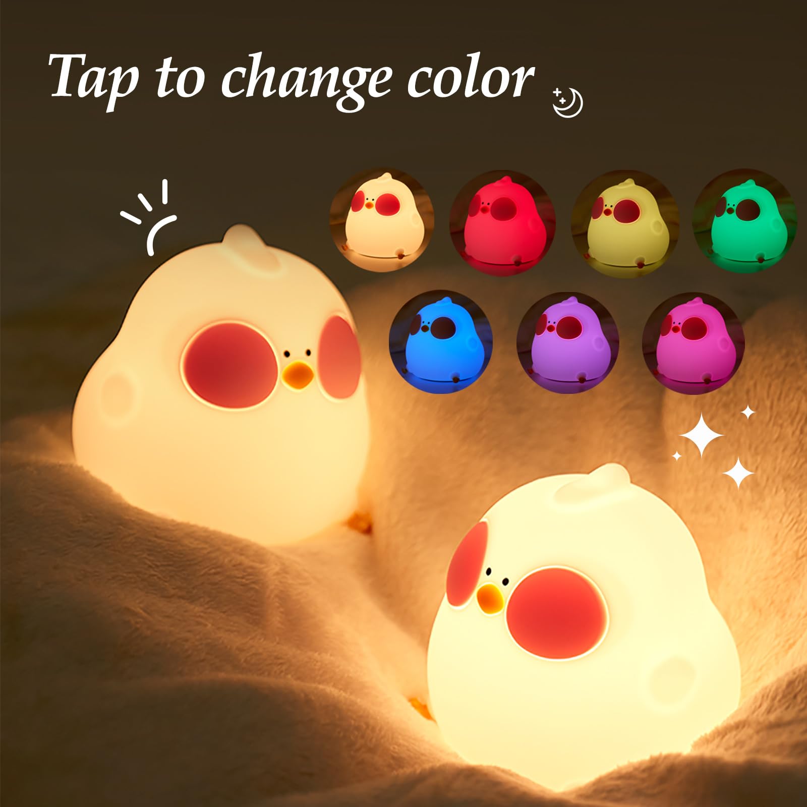 【7 COLOR CHANGING BABY NIGHT LIGHT】Press the baby night light to access 7 different color changing modes. Tap the baby night light to transform it into a quilted toy, creating a kawaii bedroom decor! Take the chicken night light with you as a child's friend!
